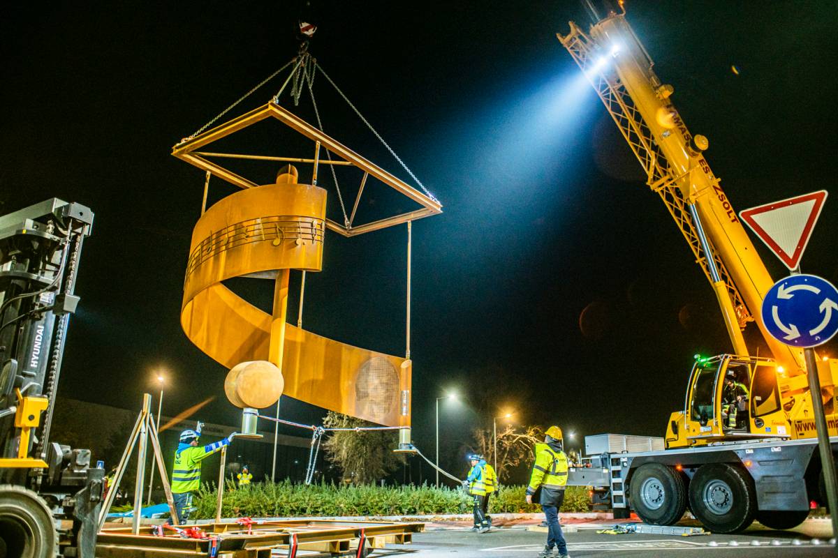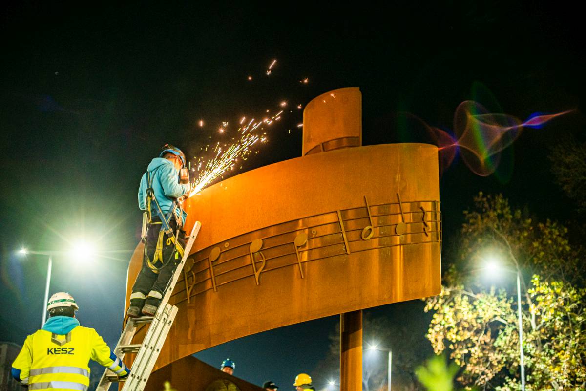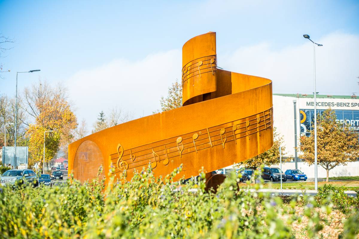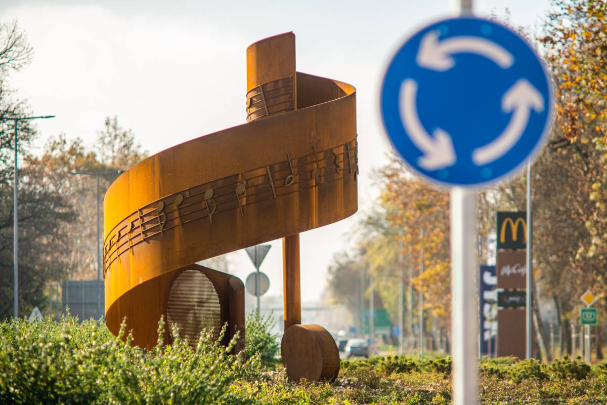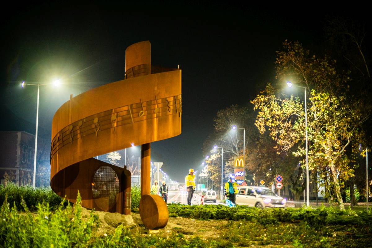 Előbbi Kodály Zoltán szellemiségére emlékeztet bennünket, a neves zenetudós előtt tiszteleg. Az ország első Kodály iskolájának közelsége is ihlette, nem mellesleg az Izsáki út az egyik legjelentősebb kapuja a városnak, így adta magát, hogy a város legnagyobb szülöttje köszöntse az ideérkezőket. A szobor egyik fő motívuma egy tekeredő acélszalag, mely az aranymetszés törvényszerűségei szerint Fibonacci-spirálban ívelődik, ugyanakkor egy violinkulcsra is hajaz, vagy éppen egy huszárlobogóra. A szalag kezdő szakaszán Kodály Zoltán pixelizált arcképe jelenik meg az áttört, lézervágott lemezen, optikai játékként. A szalag másik vége egy kotafejen támasztódik, mely akár egy zászlórúd is lehetne. A szalagon pedig egy közismert dallam kottája fut fel, amely Kodály Zoltán egyik legfontosabb műve, a Háry János daljáték betétdala az „A jó lovas katonának de jól vagyon dolga”, a zeneszerző által gyűjtött népdal első taktusai. A huszárdal felemlítése egy kis tisztelgés is egyben a közvetlen hely szellemének, azaz a két egykori huszárlaktanya és katonái előtt. A kereszteződés egyik, ill. másik oldalán állott az Erzsébet-laktanya és a Rudolf-laktanya, mindkettő még a XIX. században épült huszárlaktanya volt. A műtárgy ennek a várostörténeti időszaknak is emlékeztetője lehet. Az installáció hengerített vastag acéllemezből, valamint acélcsövekből áll. A szalagon lézervágott rátétként (hegesztve) jelennek meg a kottavonalak és a hangjegyek.
