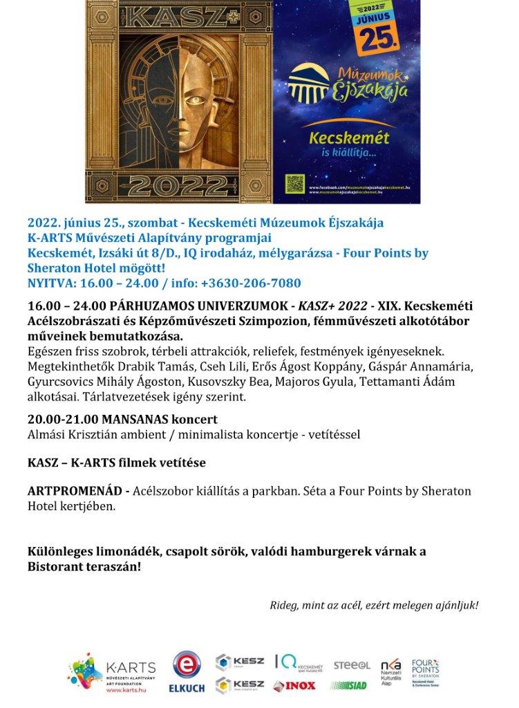 Az IQ irodaház mélygarázsában a KASZ+ 2022 - XIX. Kecskeméti Acélszobrászati és Képzőművészeti Szimpozion, fémművészeti alkotótábor műveinek kiállítását mutattuk be tárlatvezetéseken a sok látogatónak. Az érdeklődők a KASZ – K-ARTS kisfilmeket is megtekinthették, ahogy a MANSANAS koncertet is élvezhették a műtárgyak közt.